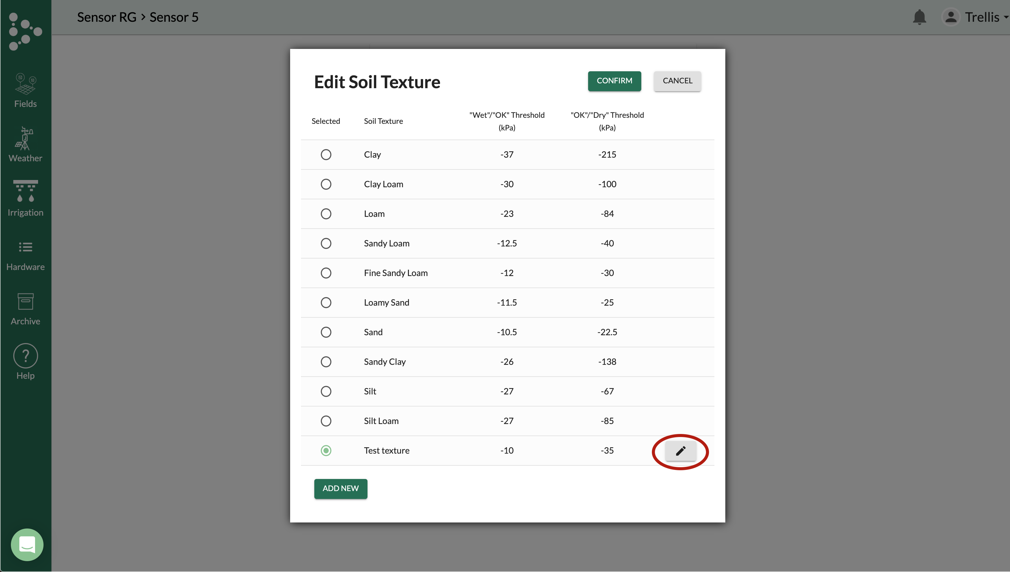 1. From the Edit Soil Texture popup, select 'Add New.'